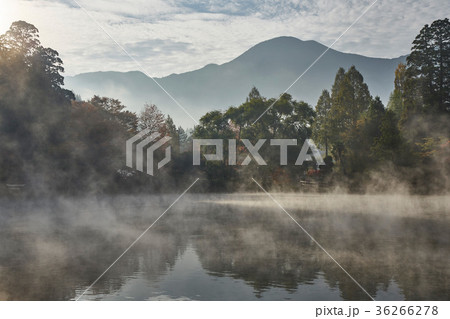 秋の湯布院 朝霧たちこめる朝の金鱗湖と紅葉