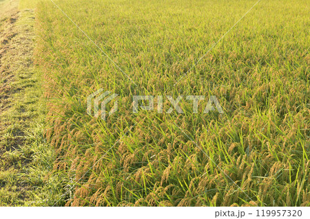 北杜市白州町、朝露に濡れる実るほど頭を垂れる稲穂かな