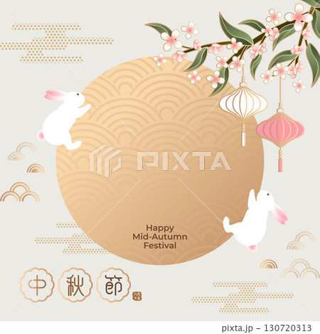 Chinese mid autumn typographic design. Realistic 3d pink lanterns and traditional beige pattern