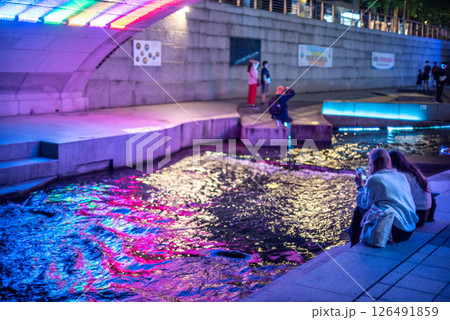 Night view of Cheonggyecheon Stream in downtown Seoul, capital of South Korea