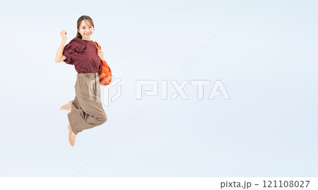 ジャンプするカジュアルウェアの女性 手作業で精密に切り抜いた背景透過全身写真PNG