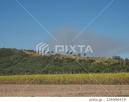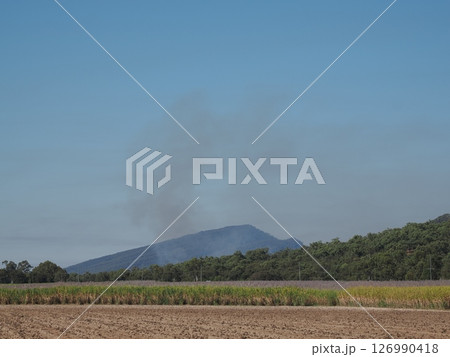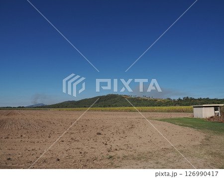 畑のある風景 森林からは火災の煙? オーストラリアのカーマイラ