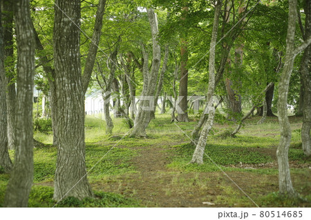 キャンプ場からの散歩道 青々とした木々 林 苔 芝生 木々 木陰 木と木の陰