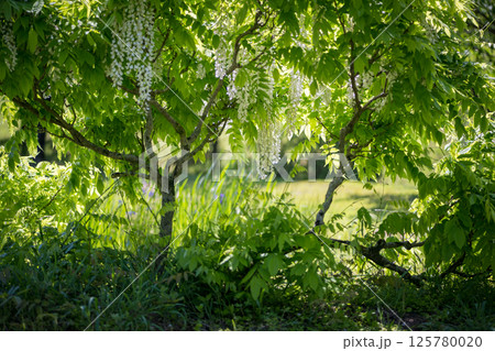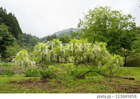 雨の古代の森に咲き乱れる春の花藤の絶景