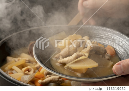 七草粥 土鍋で炊いた七草がゆを茶碗に盛り付ける