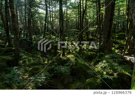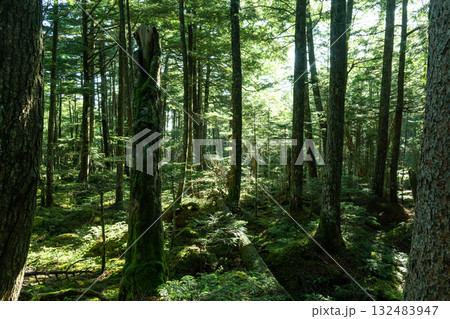 木漏れ日が差し込む鬱蒼とした森林の中に続く小道