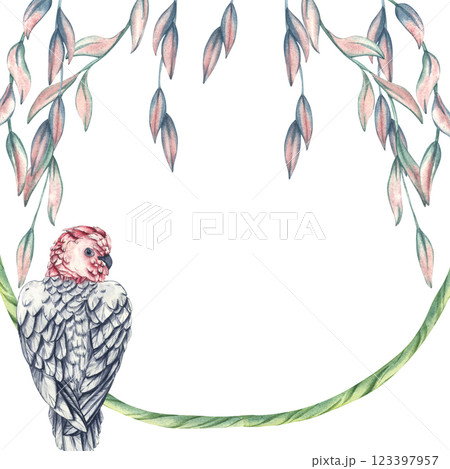 Rose-breasted Cockatoo on a branch among tropical leaves and lianas. Watercolor illustration of an Australian bird Gala with space for text. Tropical template for design of cards and invitation