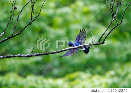 新緑の中、羽虫を捕らえるために飛び立つ(フライキャッチ)美しいオオルリ(ヒタキ科)神奈川県-2024