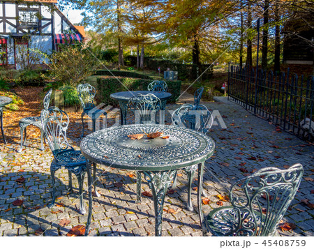 【静岡県伊豆市】公園のテーブルと落ち葉【修善寺虹の郷】