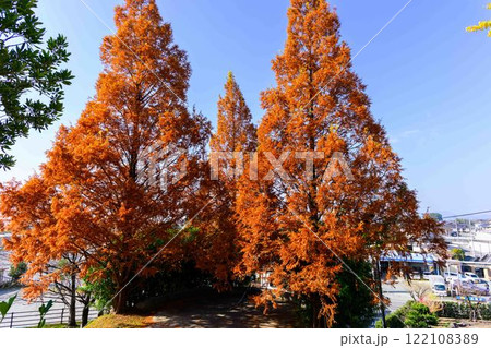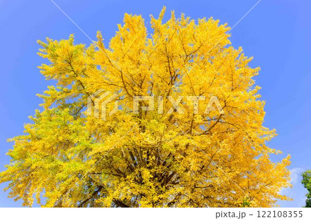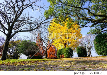 秋晴れ光芒に映えるイチョウの木と公園風景 木山城跡公園(益城町)