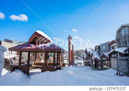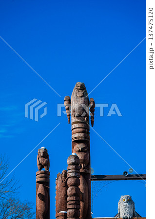 北海道阿寒・アイヌコタンに並ぶ木彫りの民芸品と伝統工芸の風景