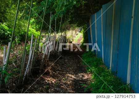 ミストシャワーの出る緑の植物のある公園の遊歩道の風景