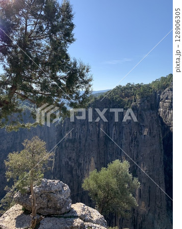 autumn mountains with mystical trees, river in gorge with yellow trees