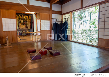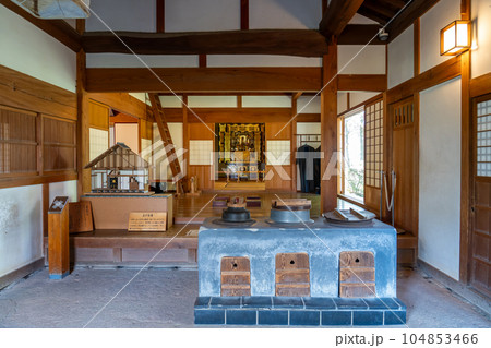 岐阜県海津市の木曽三川公園センター内にある輪中の農家の台所と上げ仏壇のある座敷