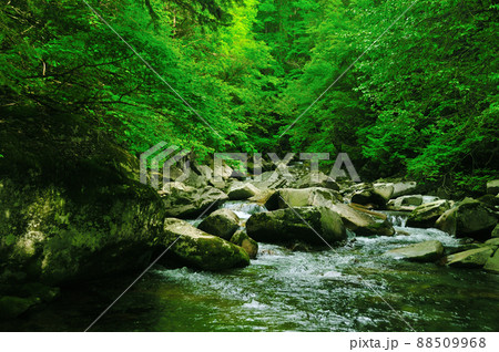 もやのかかった木曽川水系の渓流(手前岩あり)