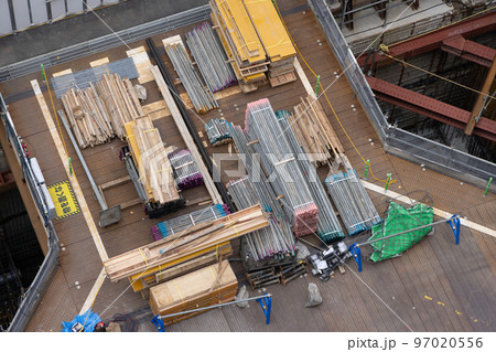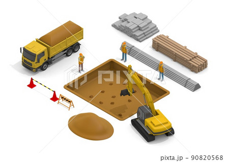 工事現場で働く人々。たくさんの資材。建設現場と重機ショベルカー。建築工事。