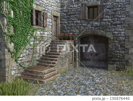 Stone Tower Entrance with Wooden Shutters 3D Illustration
