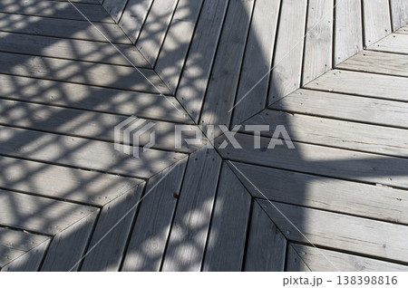 wooden platform on which the shadows of the pergola are projected