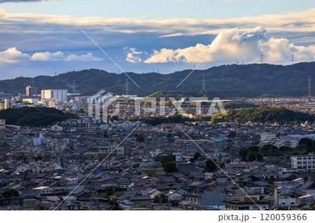 京都府最南端木津川市木津の街を望む高台からの夕景 日が傾き夕日に照らされる木津の街#23