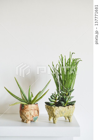 Green succulent plants thriving in unique rustic ceramic planters bringing natural home decor