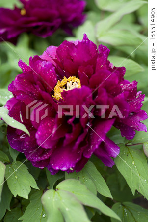 芍薬園に赤紫色のシャクヤクの花が咲いています。