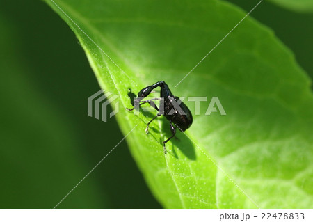 生き物 昆虫 エゴツルクビオトシブミ、メスです。揺籃作りの材料を吟味しているのでしょうか