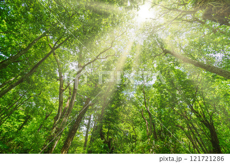 新緑の森に光芒が差し込む風景 大山木谷沢渓流