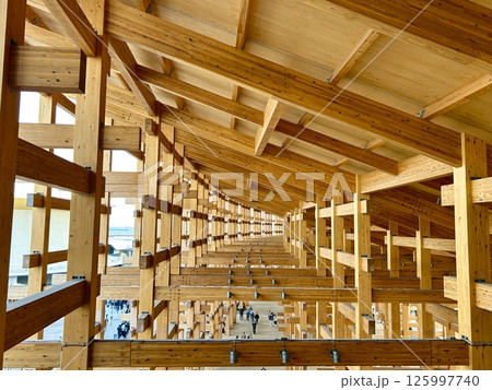 道の駅ふたつい きみまちの里 米代川・七座山へ貫通させるアーチ型大屋根 アーチトラス 木の建築文化