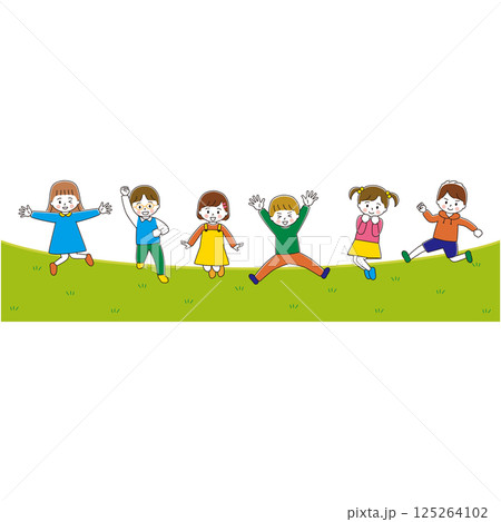 ジャンプする子どもたちのイラストセット 芝生
