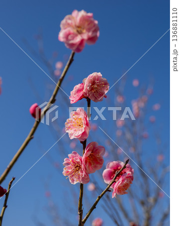 晴れた1月に咲いた美しいピンク色の梅の花「未開紅(ミカイコウ)」