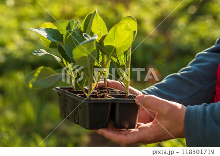 Cabbage seedlings in the hands of a person. Young cabbage. Summer in the garden