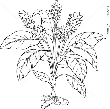 Turmeric Plant with Flowers, Root and Leaves Outline Illustration.