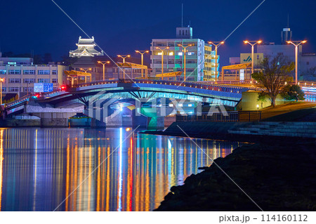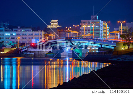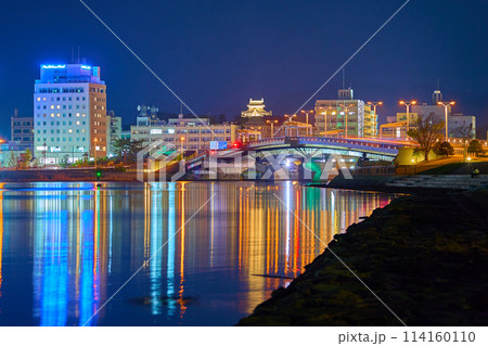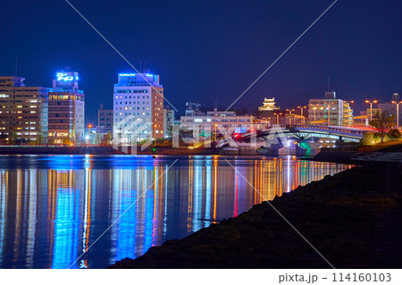 島根県松江市殿町方面の夜景を白潟公園から見る(松江城,宍道湖大橋,ホテル,マンションなど)