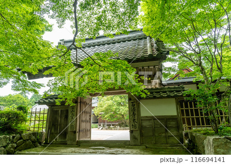 滋賀県東近江市 新緑が美しい百済寺本坊への表門と見頃の菩提樹の樹