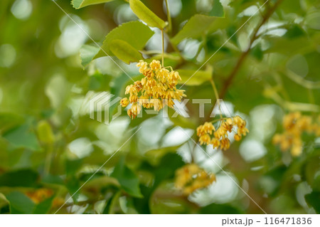 滋賀県東近江市 百済寺の境内で満開を迎え良い香りを放っている菩提樹の木