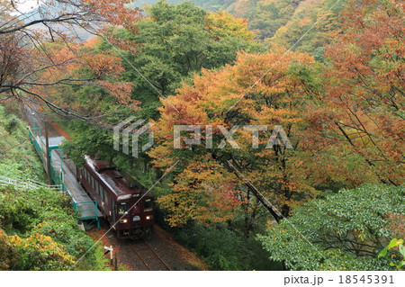 わたらせ渓谷鐵道「古路瀬付近の紅葉の中を走る列車」
