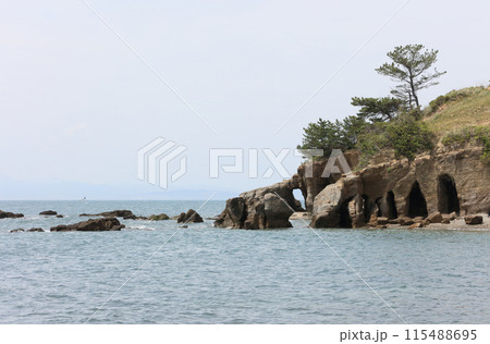 荒波に浸食された「くぐり岩」前の多数の洞窟