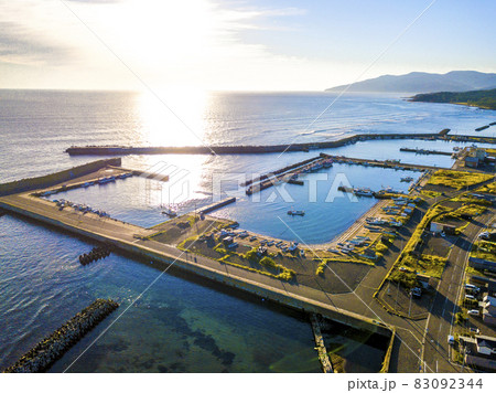 早朝の大間漁港と大間埼灯台(青森県)※遠方は北海道