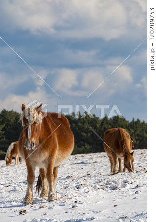 草をはむ雪原の寒立馬