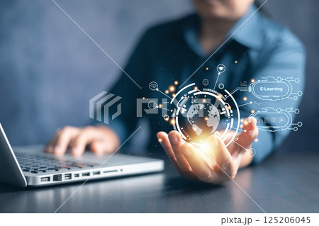 E-learning education, internet lessons and online webinar. Technology course, teaching, business training. e-learning, online education, education, internet learning. Education internet technology.