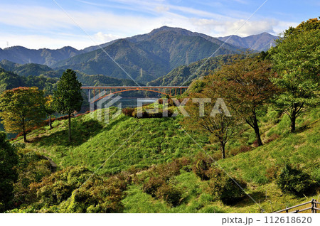 秋の鳥居原園地と虹の大橋と紅葉の丹沢山地