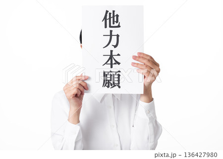 他力本願と書かれた紙を両手で持ち視線を逸らす白いシャツを着たシニア女性