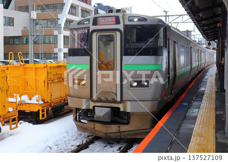 冬の小樽駅に停車中の函館本線731系電車(北海道小樽市)