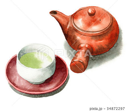 アナログ水彩急須と緑茶の入った湯呑み
