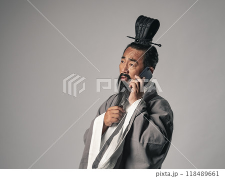 三国志に登場するような中国歴史上の偉人がスマホで通話するシーン