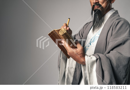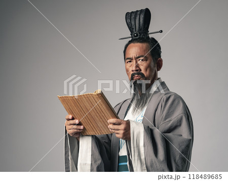 三国志に登場する諸葛孔明のような中国歴史上の人物が竹簡を持って考えるシーン