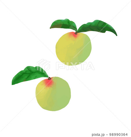 葉っぱ付きの緑色の青梅と赤く熟してきた黄色の梅の実 - 初夏・梅仕事のイメージ素材