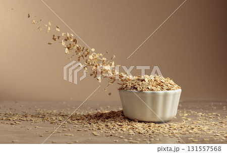 Oat flakes in motion on a beige background.