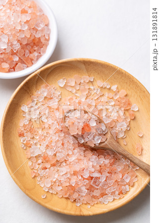 Top view of Himalayan pink salt in wooden plate with spoon, Healthy food ingredient