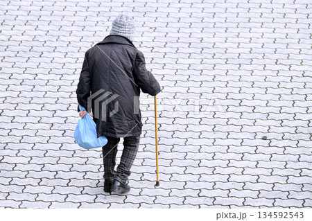 日本の横浜都市景観 見えにくい段差や凹凸…高齢化社会…杖の高齢女性…冬至で冷え込む